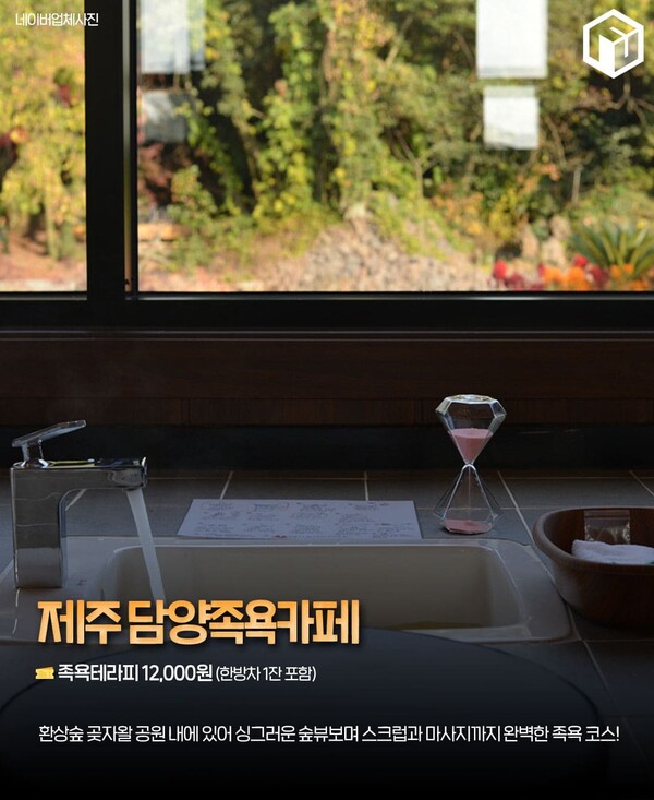 제주도의 싱그러운 풍경이 펼쳐지는 환상숲 곶자왈 공원 내에 위치한 제주 담양족욕카페입니다. 단순히 따뜻한 물에 발을 담그고 있는 족욕 뿐 아니라, 스크럽과 오일 발 마사지제가 제공되어 완벽한 족욕 테라피를 즐길 수 있는데요.