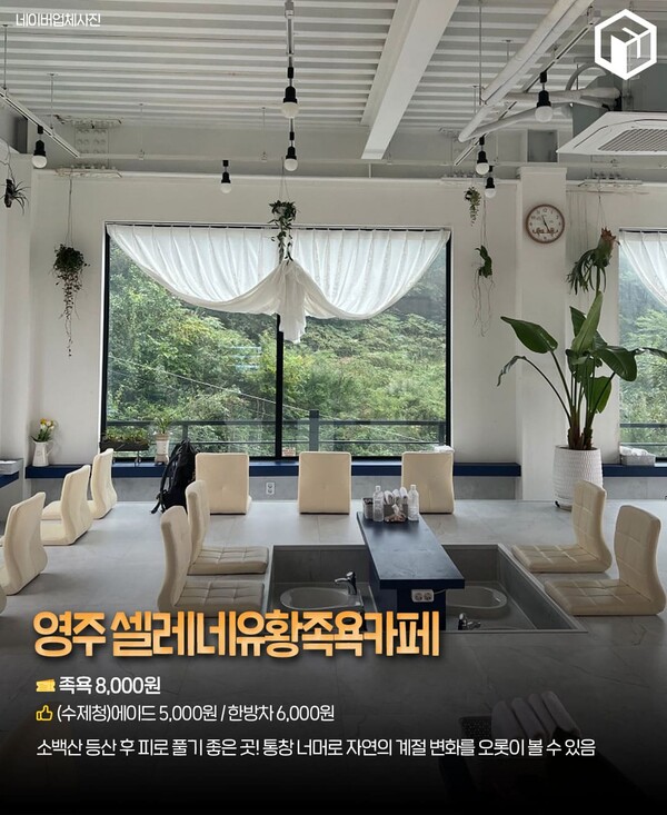 경북 영주 소백산 자락에 위치한 셀레네유황족욕카페입니다. 소백산 등산 후 피로를 풀기 좋은 족욕 카페로 통창 너머 소백산의 사계절 변화를 파노라마로 감상할 수 있어 한가롭기까지 한데요.