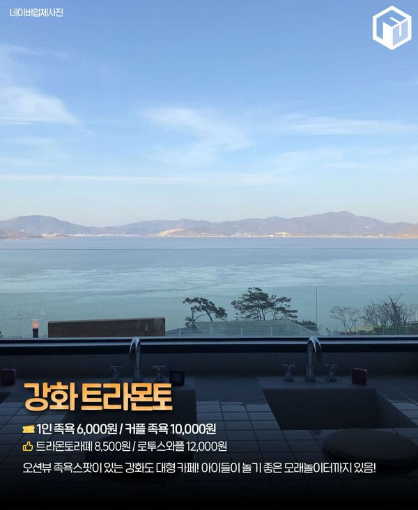 강화 트라몬토는 오션뷰 대형 카페로도 유명하지만 오션뷰 족욕 공간이 마련되어 있는 것으로도 잘 알려져 있습니다. 1인 6천원, 2인 10,000원의 가격으로 족욕제 3가지 중 하나를 골라 오션뷰를 감상하며 따뜻한 족욕을 즐길 수 있는데요. 족욕 가능한 좌석이 한정적인만큼 주말에는 웨이팅이 있을 수 있습니다.