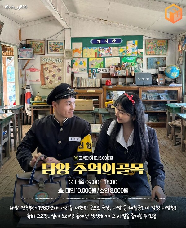 해방 전후부터 1980년대까지 우리나라의 동네 풍경을 그대로 재현해둔 체험형 전시관, 담양 추억의 골목입니다. 옛날 교복을 대여해 입고 골목 곳곳을 누비다보면 어느새 그 시절로 돌아간듯한 착각까지 드는데요. 학교앞 병아리 장수, 만화방, 방앗간 등 100여개의 테마로 가게와 체험장이 조성되어 있습니다.