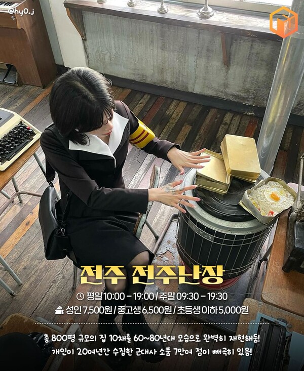 전주난장은 약 800평의 면적에 집 10채를 60~80년대 모습으로 조성한 레트로 여행지입니다. 한 개인이 25년간 직접 수집해온 근대사 유물자로 7만여점이 공간을 빼곡히 채워두고 있어 반가운 소품들과 풍경을 온전히 만끽할 수 있는데요.