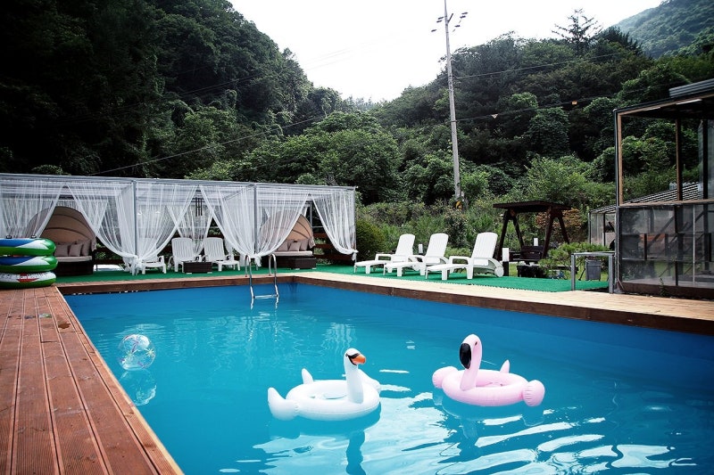 연인이라면 옐로우와 그린의 팝한 컬러감이 인상적인 카라반 9, 10호를 추천해요. 반면, 가족이라면 카라반 1~3호가 안성맞춤이에요. 침실, 욕실, 주방과 함께 넓은 거실까지 갖췄어요. 이외에도 숙소에는 수영장과 미니 골프장, 트램펄린 등이 마련돼 있습니다. 그래도 최고는 역시 펜션 앞 계곡이죠.
