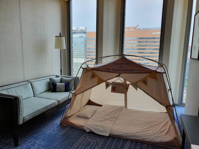 통 창문으로 서울 시티뷰와 남산을 볼 수 있는 포시즌스 호텔이에요. 고급스러우면서도 깔끔하고 넓어서 아이들과 함께 머물기 좋아요. 요청하면 아이용 텐트도 설치해 준답니다. 이름까지 새겨져 있어서 아이가 좋아해요. 샴푸, 컨디셔너, 바디워시가 제공되고 아이용 샴푸, 바디워시, 비누가 있어요.
