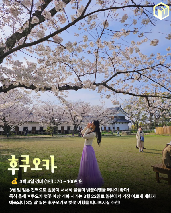 일본 남단 후쿠오카는 일본에서도 가장 먼저 벚꽃을 만나볼 수 있는 여행지입니다. 올해 후쿠오카 벚꽃 예상 개화 시기는 3월 22일로 벚꽃 여행 추천시기는 3월 마지막주와 4월 첫째주 사이입니다.