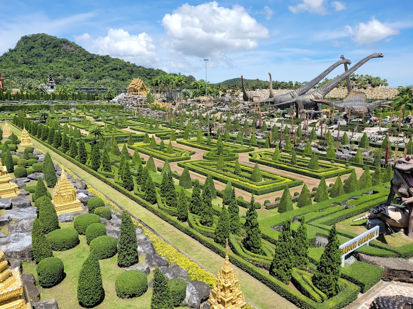 17세기 프랑스식 정원, 스톤헨지 재현, 창의적인 토피어리 전시, 선인장, 분재, 열대 야자수로만 만든 정원 등 다양한 디자인으로 국제적인 상을 여러 차례 수상했습니다. 또한 670여 종의 토종 및 잡종 난초가 서식하고 있는 곳이기도 합니다. 정원을 방문하는 동안 태국 전통 춤, 복싱, 드럼 연주를 정기적으로 볼 수 있습니다.