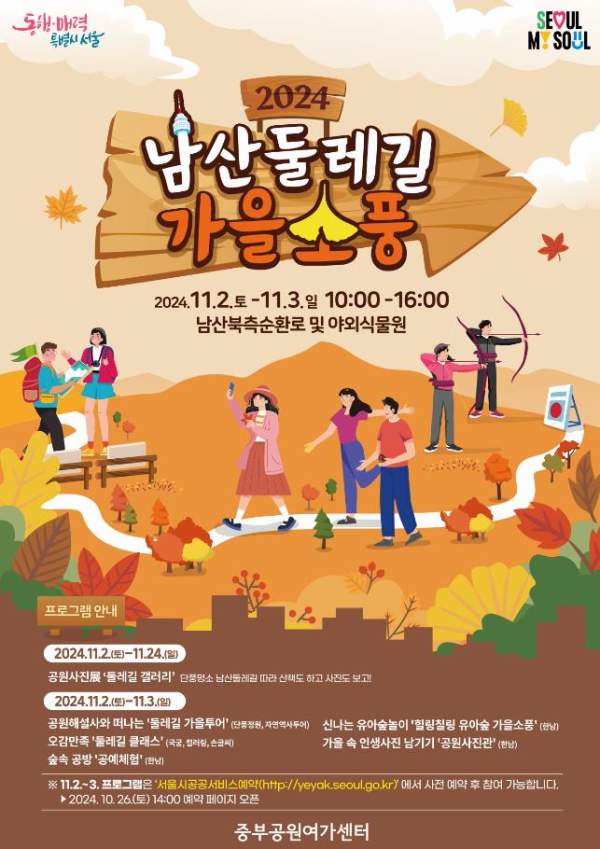 서울 중부공원여가센터는 2025년 11월 1일(토)부터 11월 30일(일)까지, 도심 속 자연 공간인 남산둘레길을 중심으로 2025 남산둘레길 가을소풍을 운영합니다. 이 행사는 단순한 단풍 관람을 넘어서, 시민이 직접 참여하고 경험할 수 있는 문화 축제로 기획되었습니다. 남산의 숲길이 계절별로 지닌 매력을 살리며, 시민들이 자연과 가까워지고, 역사와 이야기를 배우는 장을 만드는 것이 이번 기획의 핵심입니다.