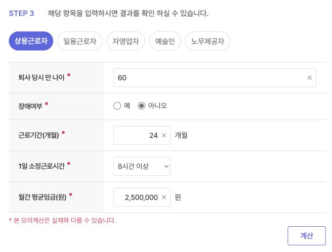 - 월 급여·가입기간·연령 등 입력 → 예상 일액·기간 산출