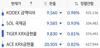 - ACE/TIGER KRX금현물 등: KRX 금시장 금(순도 99.99%)을 직접 편입해 추종력과 낮은 보수를 강조.