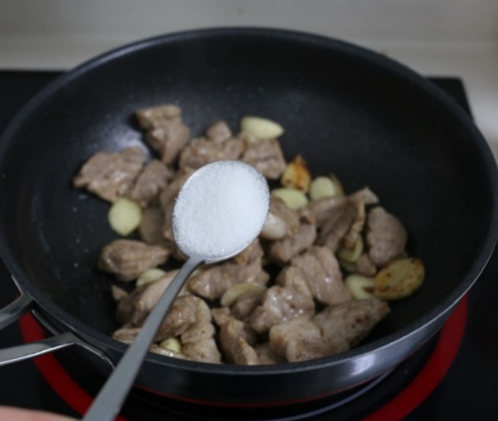 고기를 예열된 팬에 깔고 뒤집어가며 익혀주세요. 마늘을 넣고 함께 볶아주세요. 고기가 충분히 익을 때까지 조심스럽게 익혀야 합니다.