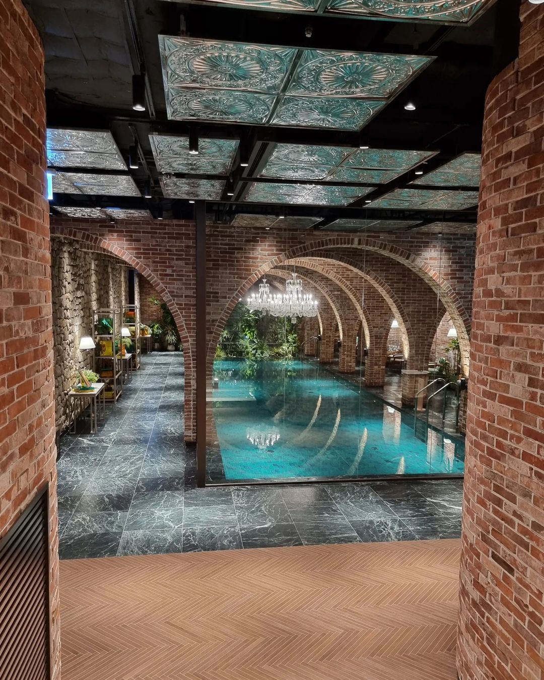 실내 수영장은 아치형 타일 디자인과 상큼한 색감의 타일바닥, 구석에 위치한 샹들리에, 식물과 화분을 활용한 건축디자인이 돋보여서 감성적인 느낌이에요.