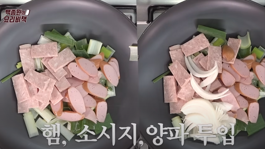 소시지와 햄은 얇게 써야 국물의 맛이 돋보여요.