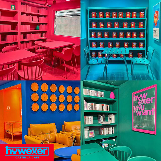 삼화페인트와 카스테라의 궁합은... 직접 찾아가서 알아보세요 지하철 홍대입구역에서 3번 방향으로 나오면 하우에버가 있습니다. 먹을 수 있는 '물감'을 한 컵 받아 좋아하는 맛의 카스텔라 케이크 위에 붓고 한 입 베어 물면 된다. 다층 구조의 카페 전체가 재미있고 생동감 넘치는 색상으로 꾸며져 있어 사진 찍기 좋은 공간입니다.