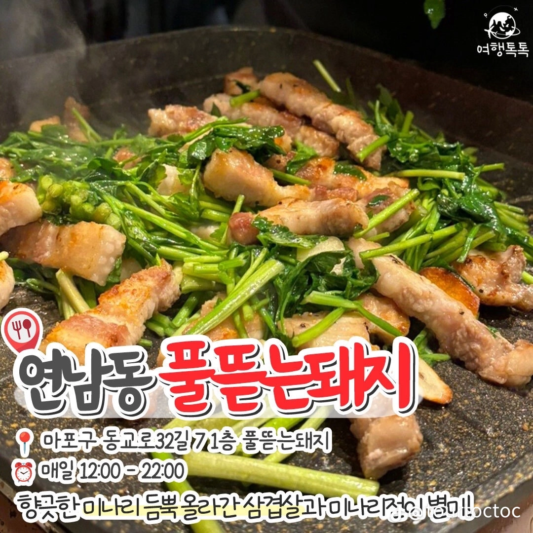 - 마포구 동교로32길 7 1층 - 요새 미나리 듬뿍 올라가는 삼겹살집 찾기 힘들죠?! 연남동 풀뜯는돼지에서는 아낌없이 미나리 투척!! 삼겹살과 함께 먹는 미나리전과 된장찌개의 삼박자가 환상적이에요!! 꼭 시켜주기!
