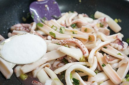 파가 노르스름하게 볶아지면 오징어를 넣고 볶다가 설탕 1큰술을 넣어 볶습니다.