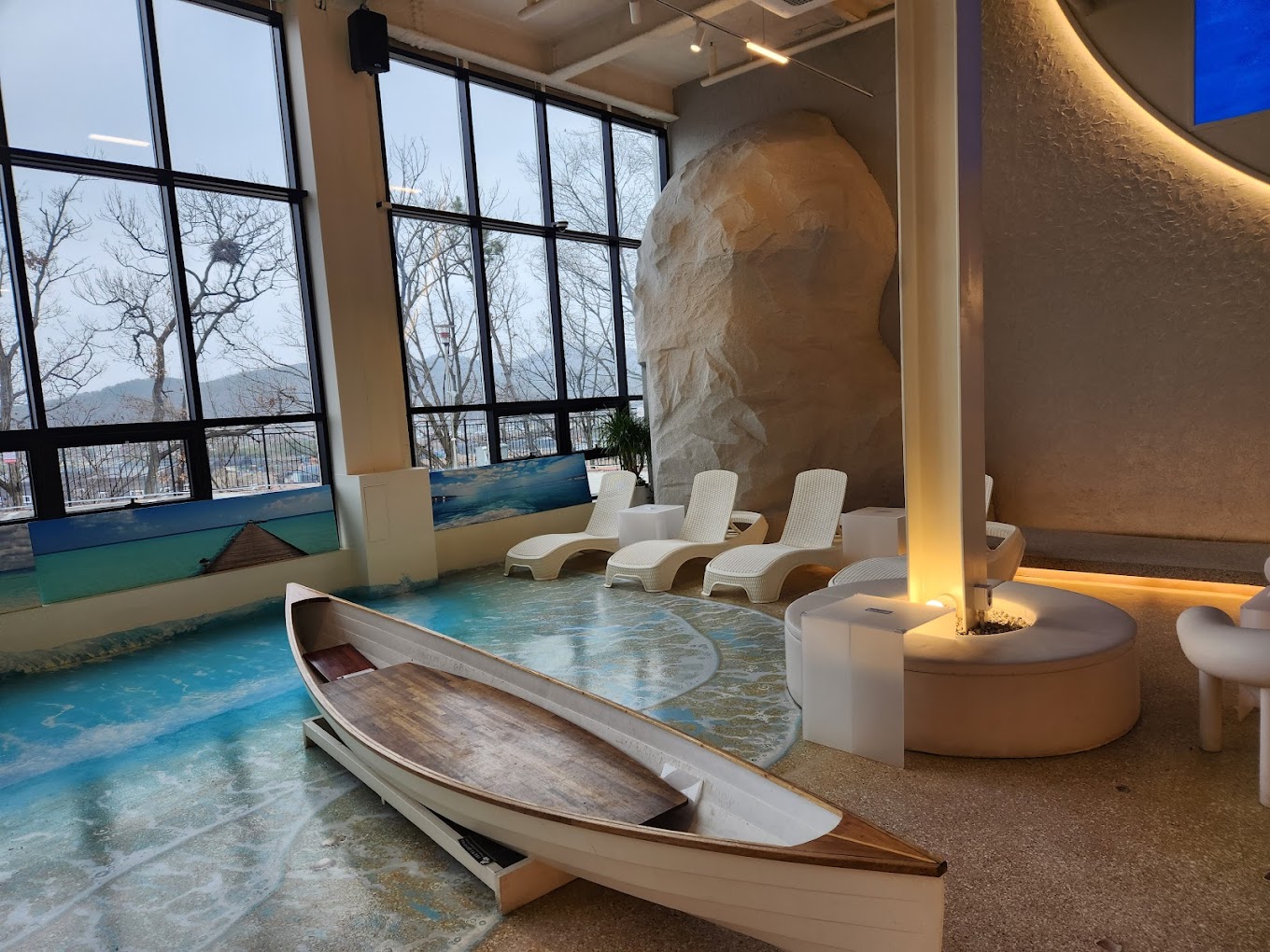 아모엔에서 단 11분 거리에 위치한 이곳은 '동네변호사 조들호'의 촬영지이기도 합니다. 이 카페는 발가락 사이에 모래가 없어도 해변의 기분을 느낄 수 있는 곳입니다. 엄청난 규모의 카페와 레스토랑이 있으며, 베이커리 옵션도 다양합니다. 또한 아이들을 위한 실내 해양 공원 옆에 있습니다. 1층에는 작은 보트가, 옥상에는 커다란 돌 구조물이 있는 등 카페의 모든 층이 독특하고 그림 같은 장식으로 꾸며져 있습니다.