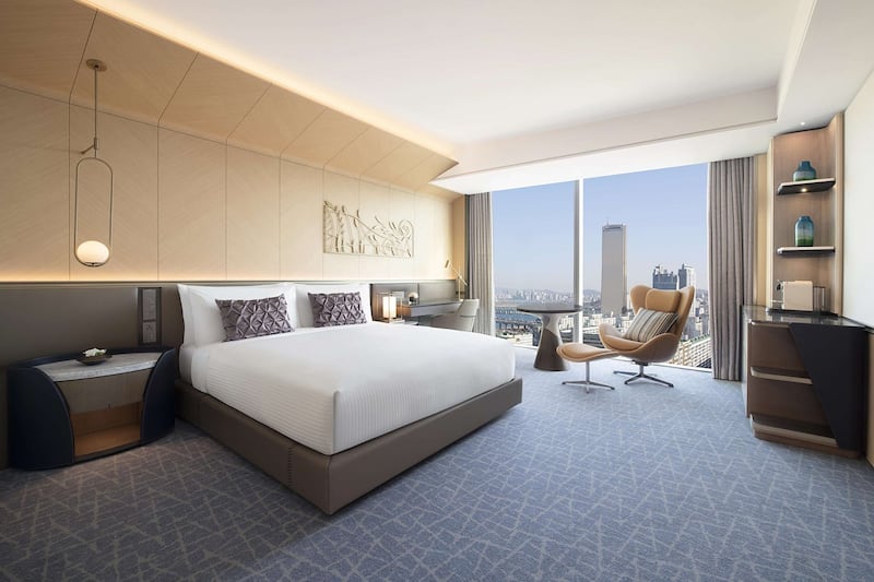 여의도역 5호선, IFC몰, 더현대 서울과 인접한 콘래드 호텔은 호캉스는 물론 쇼핑과 엔터테인먼트에 최적화되어 있는 5성급 호텔입니다. 서울 시내 동급 호텔 중 객실 크기가 큰 편이며, 한강과 서울의 스카이라인을 전망할 수 있어요.