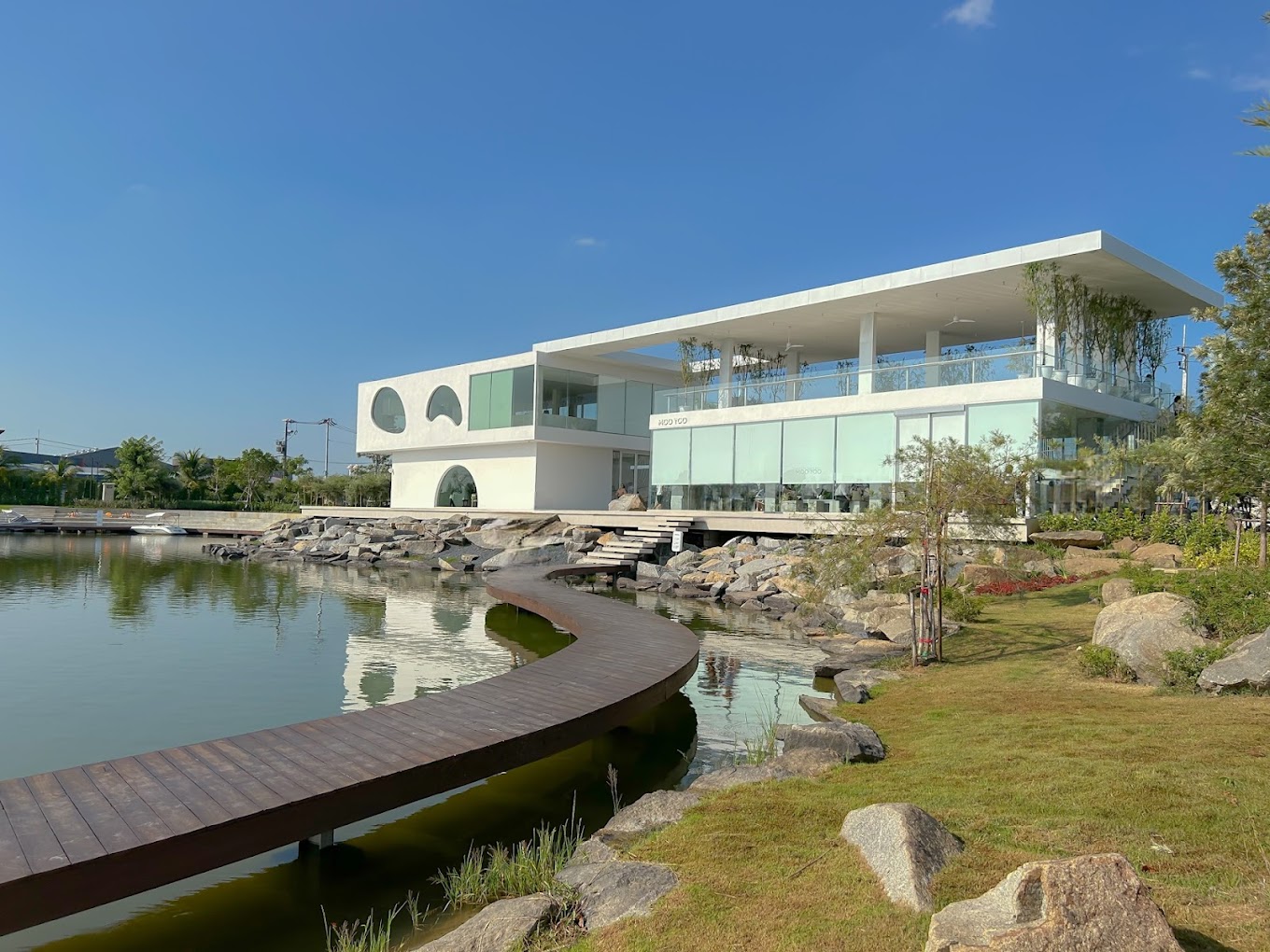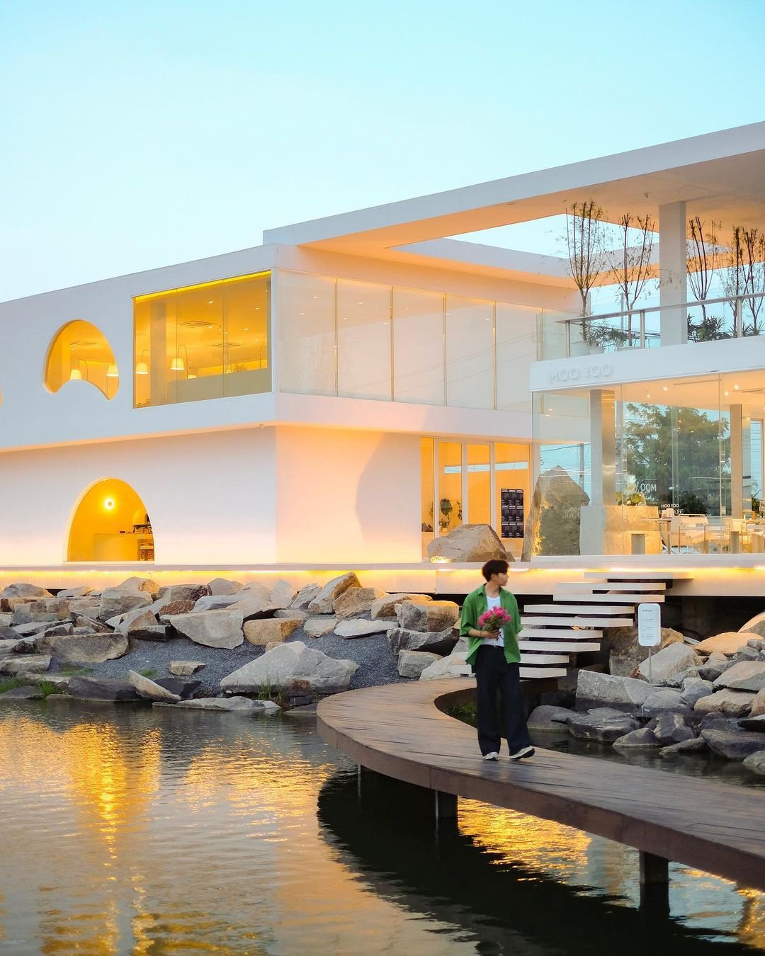 무유 로즈 하우스 카페는 방콕 서쪽 나콘파톰에 위치해 있으며 시내에서 차로 약 1시간 거리에 있습니다. 직접 대중교통이 없기 때문에 방문객들은 보통 자가용이나 투어 버스를 이용해 카페에 도착합니다. 이 카페는 미니멀한 흰색 미학을 따르며 자연의 아름다움을 강조합니다. 넓은 인공 호수를 마주하고 있으며 세련된 한국식 유리 건물이 특징입니다.