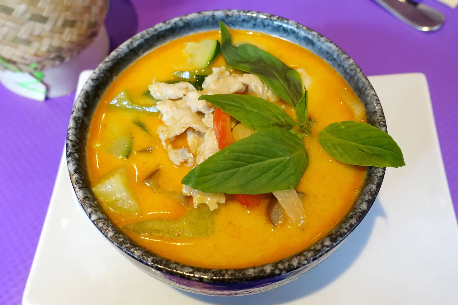 깽댕은 고기, 레드 카레 페이스트, 부드러운 코코넛 밀크를 넣은 향기로운 레드 카레에 얇게 슬라이스한 카피르 라임 잎을 토핑한 요리예요. 눈에 띄는 색상에도 불구하고 깽댕의 맛은 상당히 순하죠. 매운 음식을 원한다면 신선한 고추를 요청하실 수 있어요. 베지테리언이나 비건도 셰프에게 고기를 두부로 바꿔 달라고 요청하면 맛있게 드실 수 있어요.