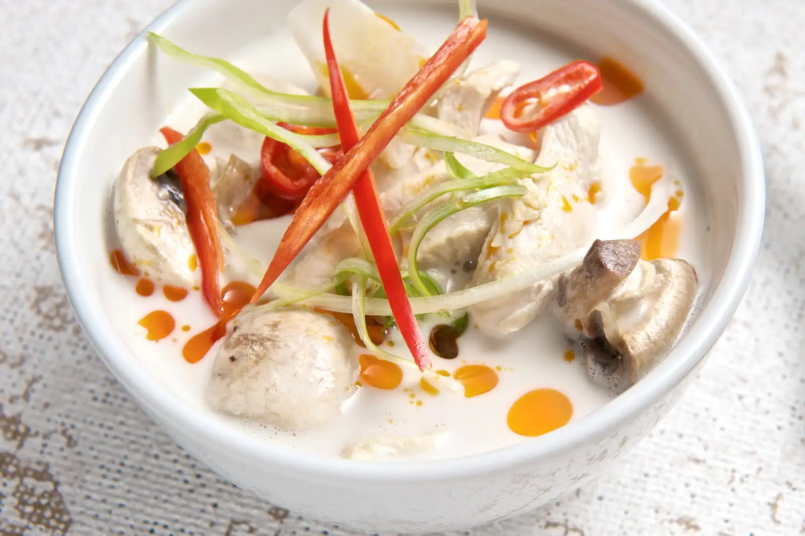 톰얌의 순한 맛 버전이라고 할 수 있는 똠카까이는 아주 매운 고추, 얇게 썬 어린 양강근, 으깬 샬롯, 레몬그라스 줄기, 부드러운 닭고기 조각을 넣어서 만들어요. 매운맛을 줄이기 위해 코코넛 우유를 넣은 후 신선한 라임 잎으로 토핑을 하죠. 대부분의 태국 스타일 수프와 마찬가지로 부드러운 똠카까이와 쌀밥 한 그릇을 같이 먹어도 좋아요.