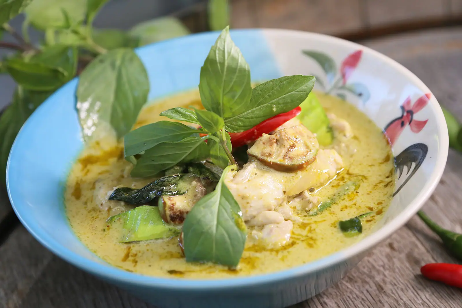 깽케우완카이에 사용되는 재료는 대부분의 태국 카레와 같지만 녹색 고추 때문에 유니크한 컬러가 나게 되죠. 이 그린 치킨 카레에는 코코넛 밀크, 체리 크기의 가지, 죽순, 양강근, 레몬그라스, 고수풀, 스위트 바질이 들어가요. 클래식한 똠얌보다 더 풍부하고 단맛이 나며, 플랫브레드나 쌀밥과 드시면 잘 어울려요.