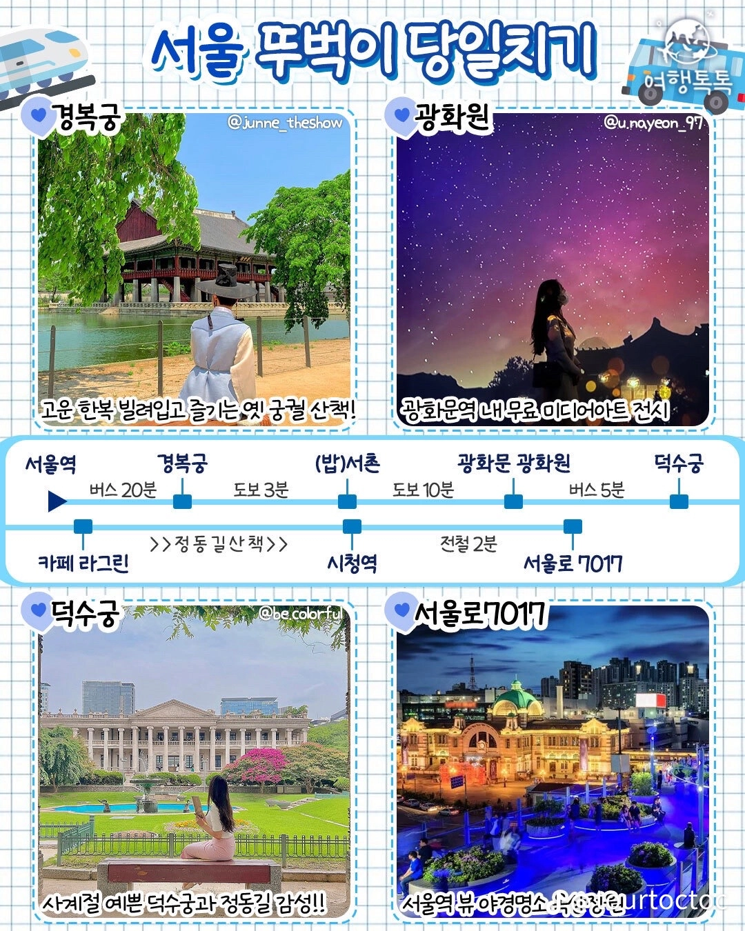 서울역 - 경복궁 - 서촌(밥) - 광화원 - 덕수궁 - 카페 라그린 - [정동길산책] - 시청역 - 서울로7017 경복궁 갈 때는 한복대여 강추! 덕수궁 정동길은 사계절 언제나 예쁘니까 노을질 때 맞춰서 걸어보기!