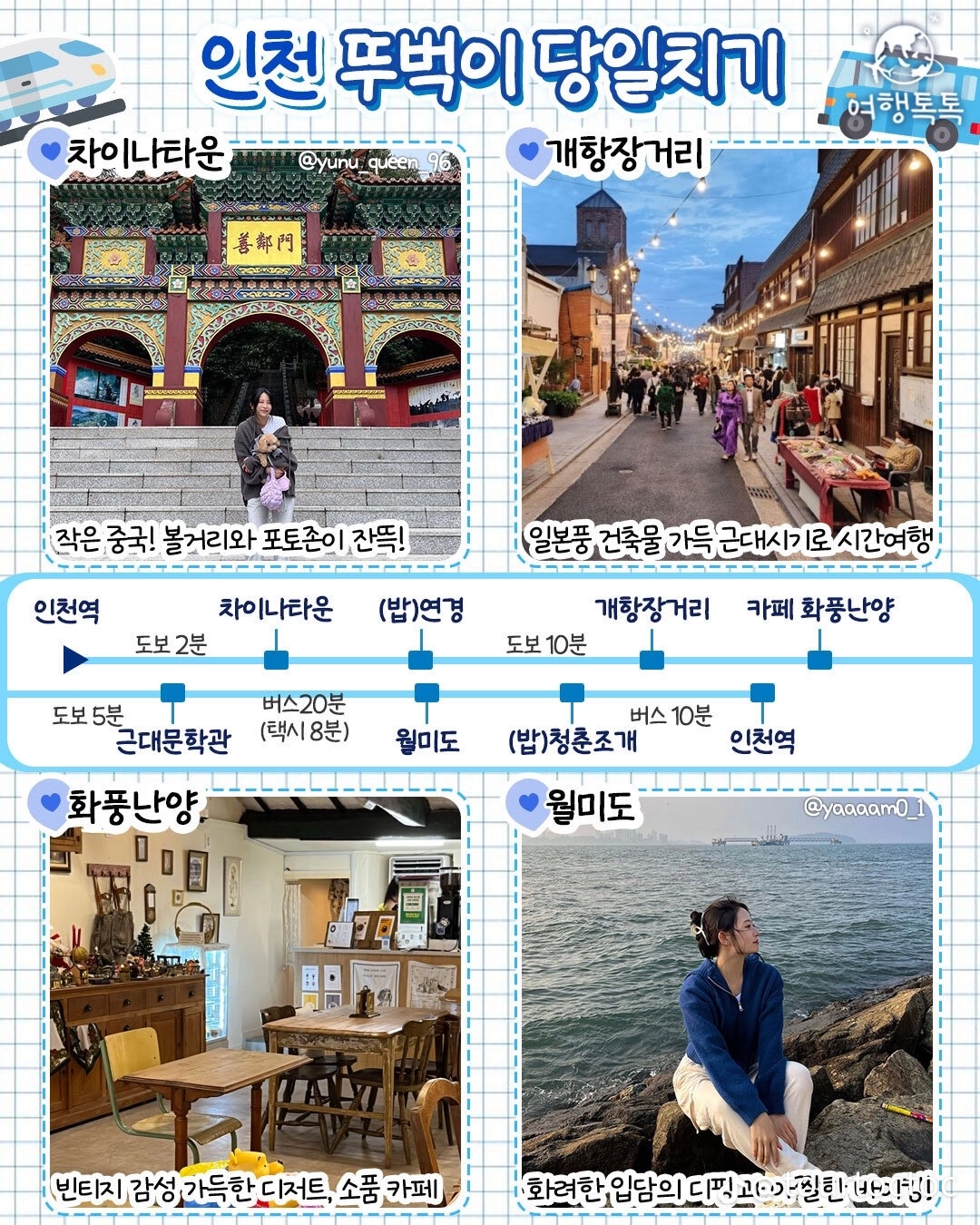 인천역 - 차이나타운 - 연경(밥) - 개항장거리 - 카페 화풍난양 - 근대문학관 - 월미도 - 청춘조개(밥) 인천역
