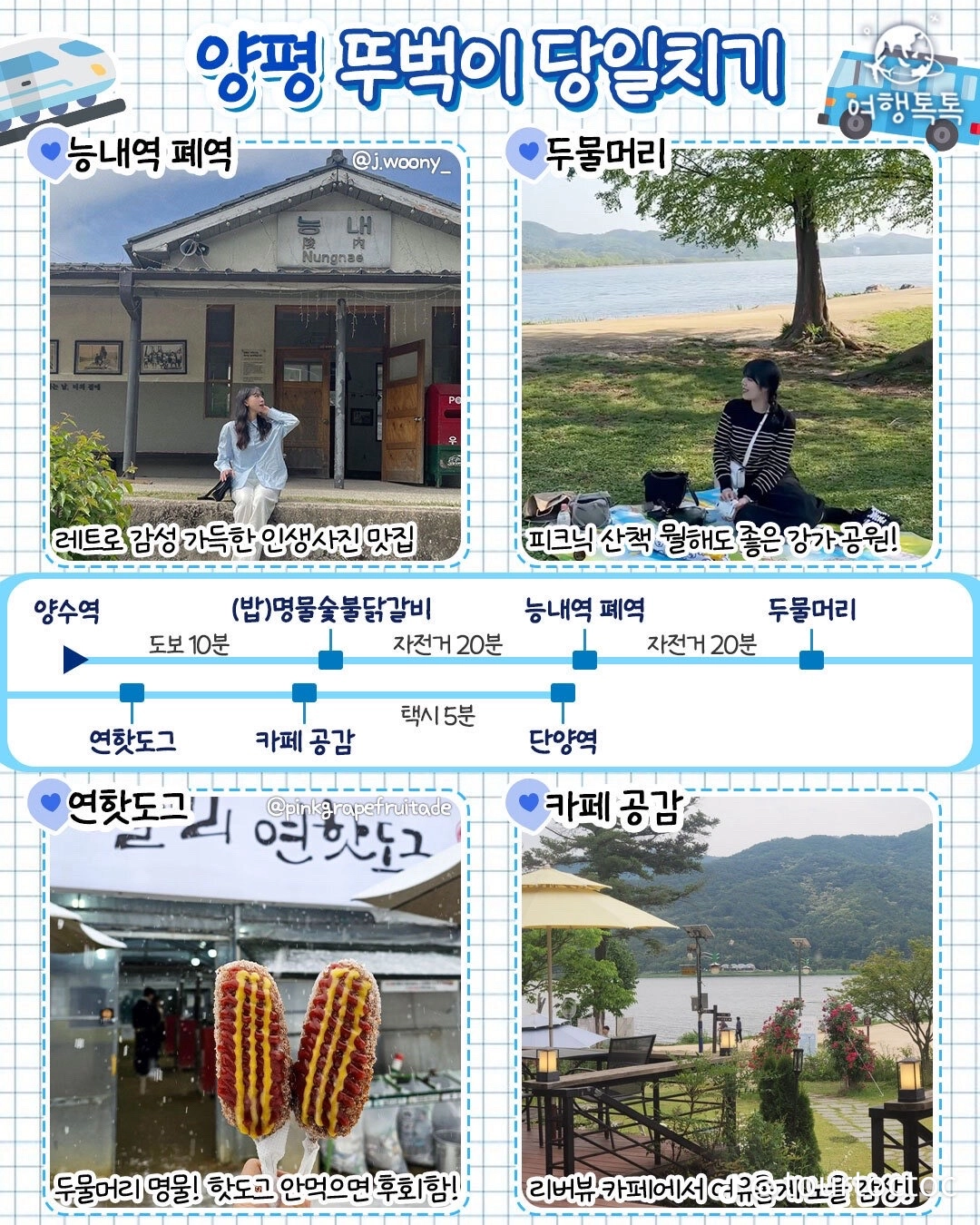 양수역 - 명물숯불닭갈비(밥) - 능내역폐역 - 두물머리 - 연핫도그 - 카페 공감 - 단양역 • 능내역과 두물머리는 자전거를 대여해서 오가기 좋아! 두물머리에선 연핫도그 꼭 먹어주기 쫀맛..!
