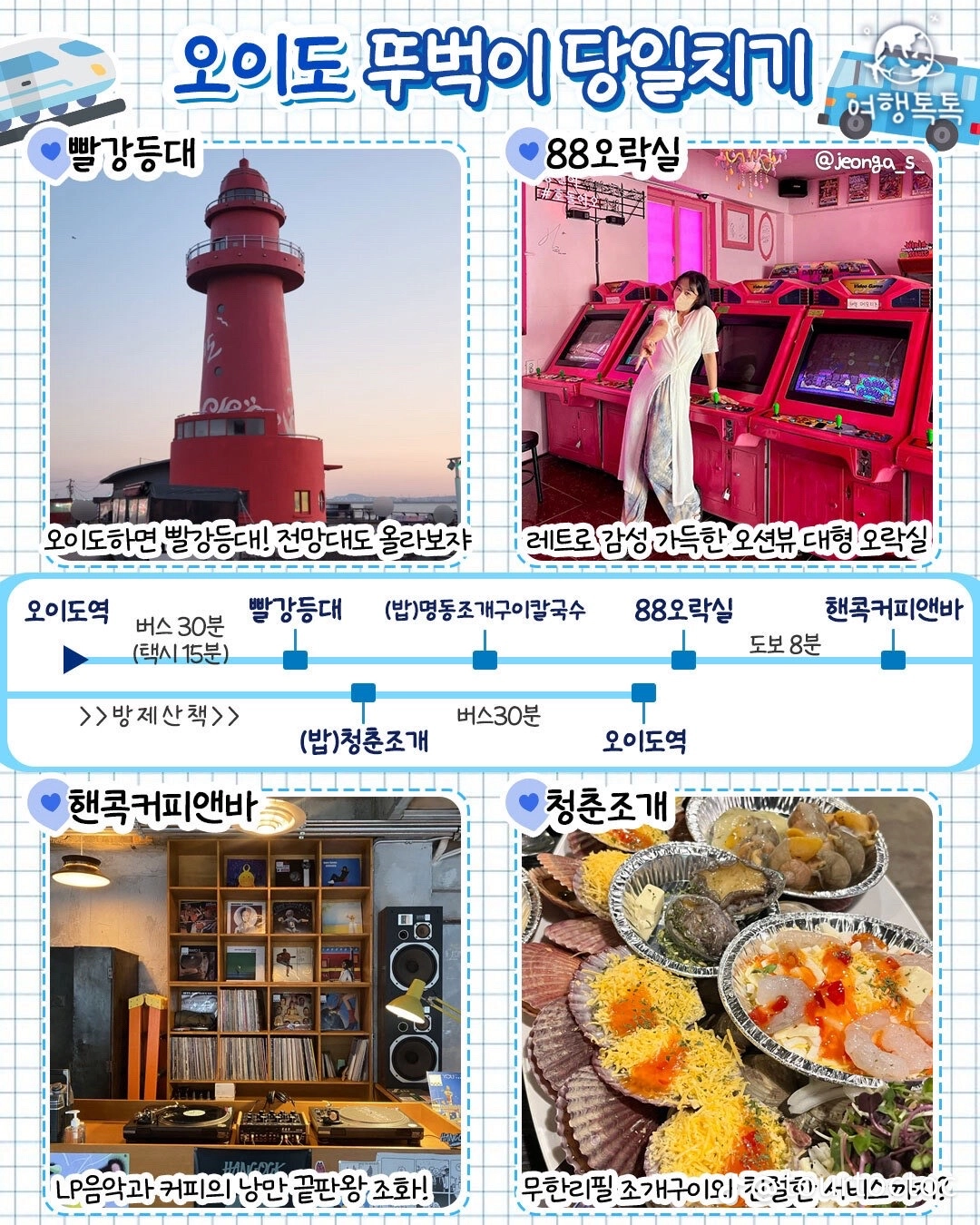 오이도역 - 빨강등대 - 명동조개구이칼국수(밥) - 88오락실 - 핸콕커피앤바 - [방제 산책] - 청춘조개(밥) - 오이도역 • 바다내음 맡으며 산책하기 좋은 오이도! 조개구이 무한리필, 칼국수까지 신선한 해산물 맛집 가득! 레트로한 오션뷰 대형 오락실에서도 놀기 좋다구!!