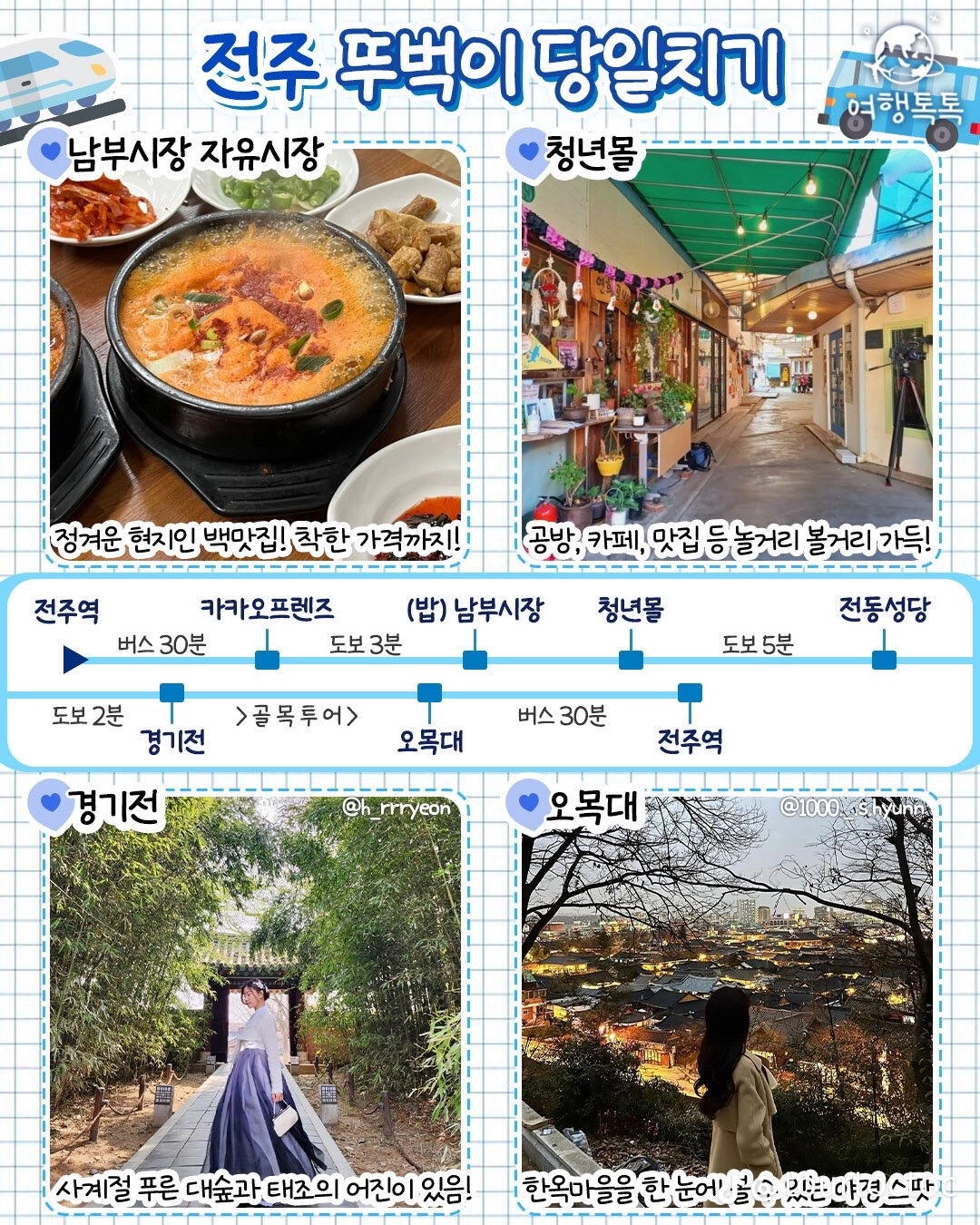 전주역- 카카오프렌즈 - 남부시장(밥) - 청년몰 - 전동성당 - 경기전 - [골목투어] - 오목대 - 전주역 전주한정판! 카카오프렌즈부터 오랜 역사의 식당들이 있는 남부시장! 한복 빌려입고 한옥마을 곳곳을 투어해봐용! 마무리는 오목대나 덕진공원에서 야경감상으로 깔끔하게~!