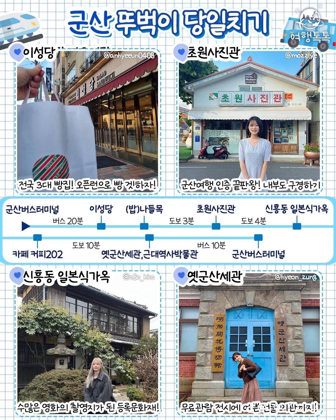 군산버스터미널 - 이성당 - 나들목(밥) - 초원사진관 - 신흥동 일본식가옥 - 카페 커피202 - 옛군산세관, 군산근대역사박물관 - 군산버스터미널 • 전국 3대빵집 이성당! 오픈런 안하면 유명한 빵은 품절이니까 달려달려! 도보 여행도 편리한 군산에서 사진놀이 하면서 알차게 근대 문화 구경하기!