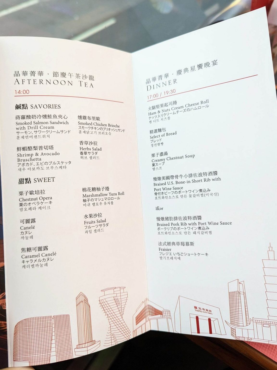 실제 버스가 운행하는 호텔은 계절에 따라 다르며, 저희가 방문한 날은 리젠트 호텔 타이베이였습니다. 채식주의자를 위한 메뉴가 따로 있습니다. 예약 웹사이트에서 디너 메뉴를 확인하실 수 있습니다.