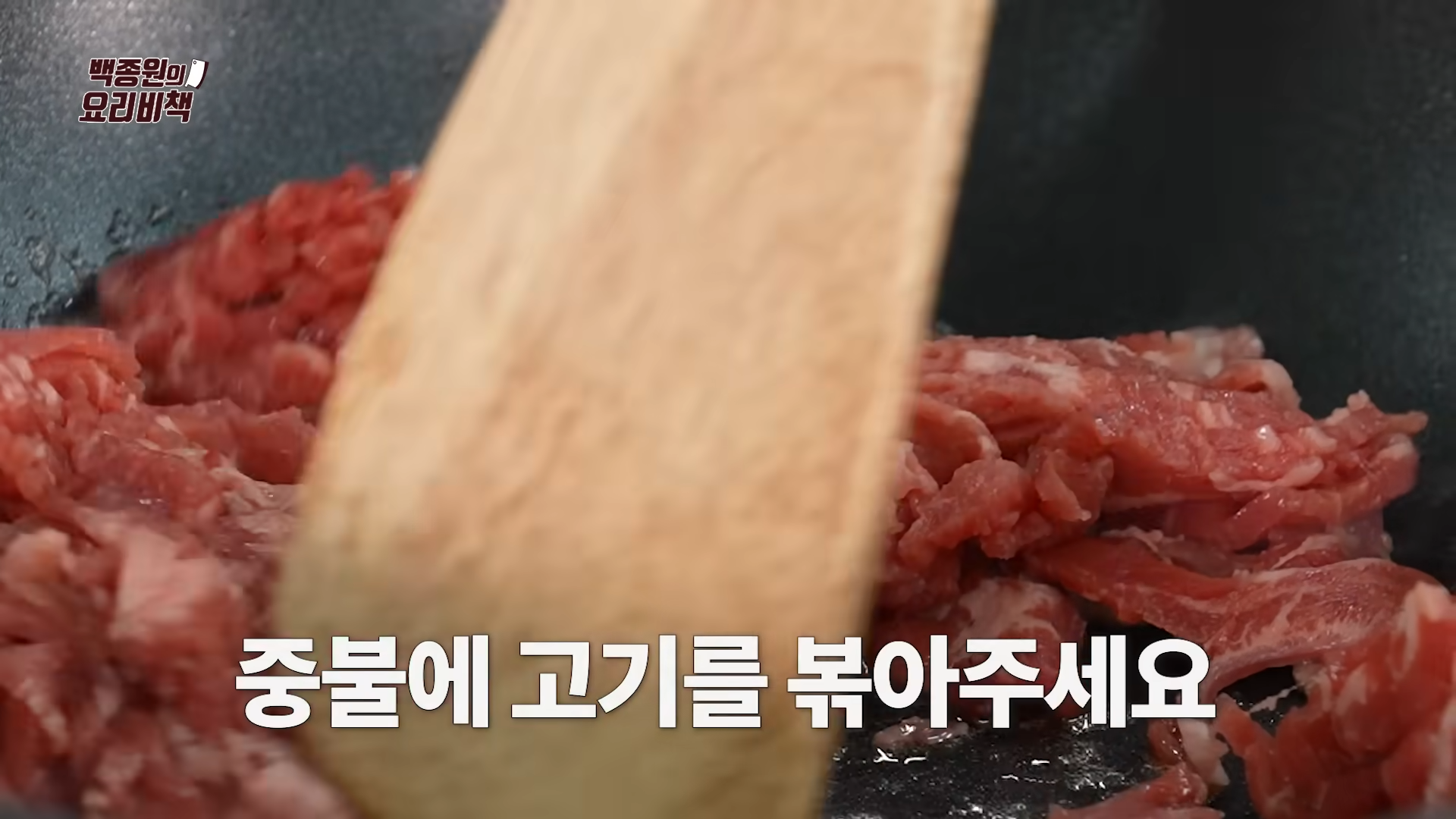 고기를 넣기 전에 참기름을 먼저 넣고, 반 정도로 불을 줄여서 볶아요.