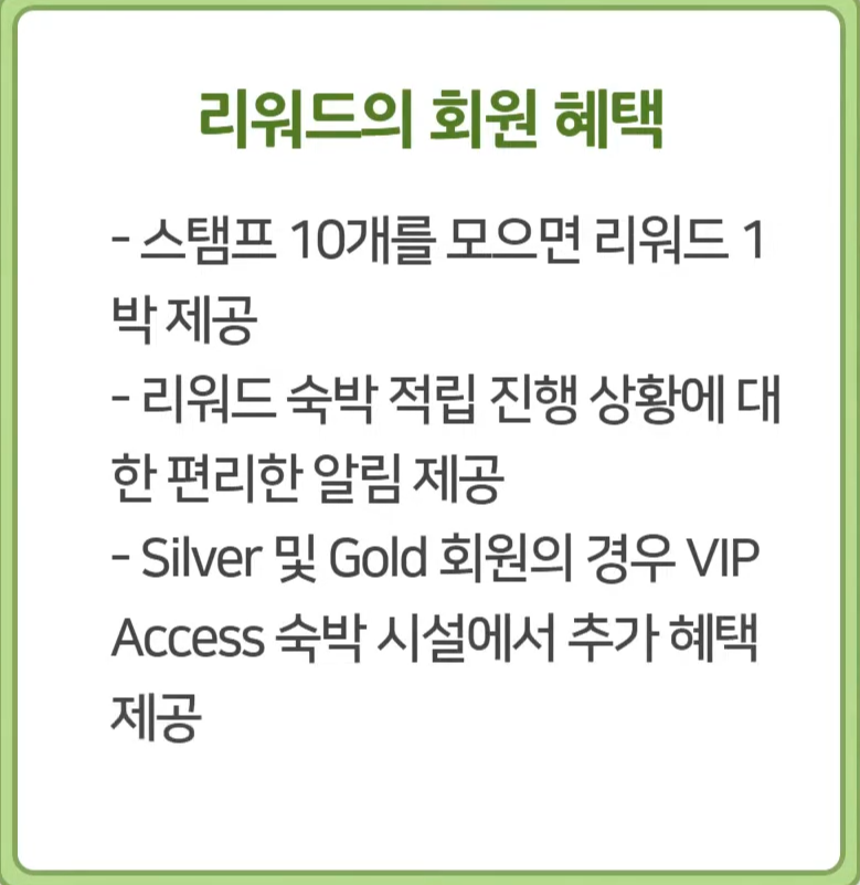 회원에게는 스탬프 10개 모을 때 1박 리워드를 제공합니다.