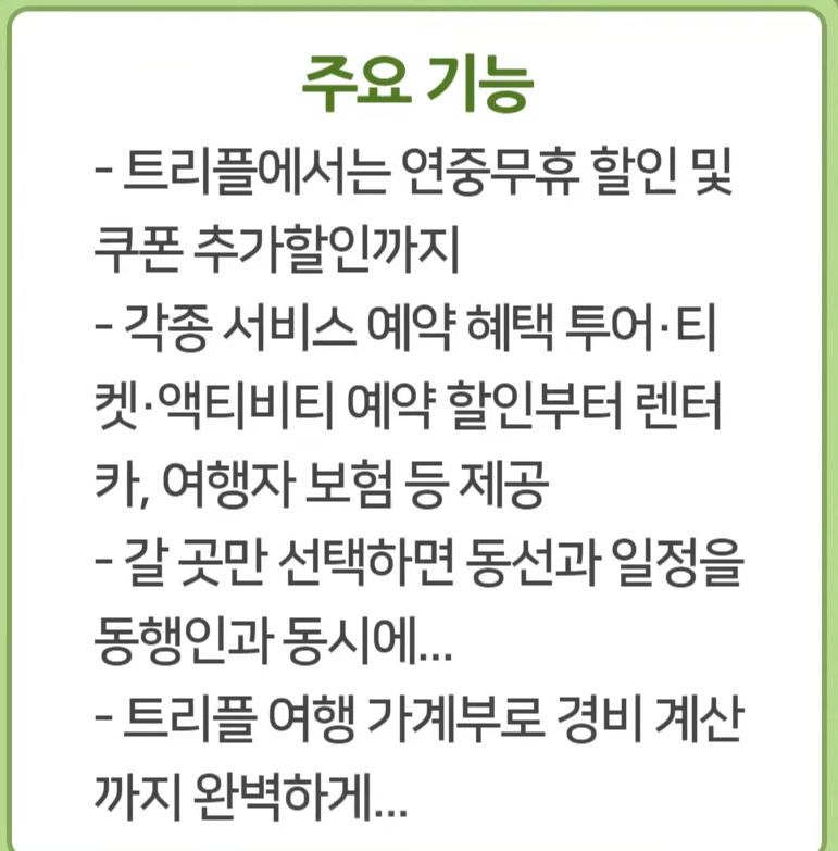 트리플은 친구와 계획을 세우며 해외 여행을 할 수 있는 앱으로 강점이 있는데, 국내 호텔 할인 혜택이 더 필요하다는 단점이 있어요.