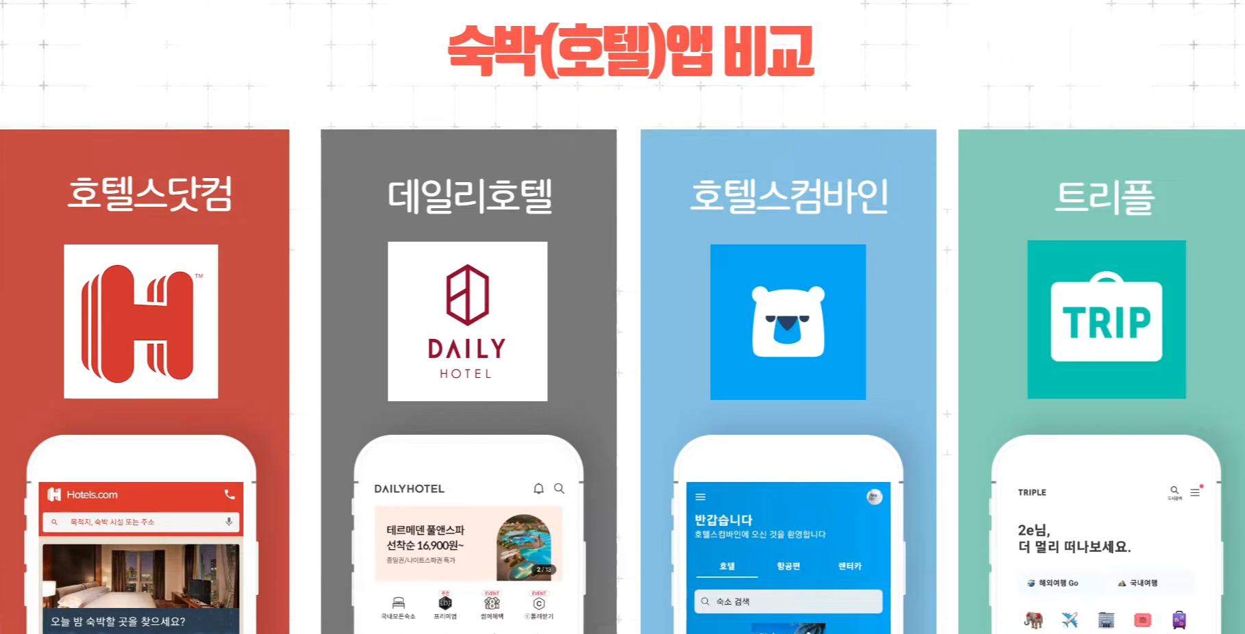 호텔스닷컴, 데일리호텔, 호텔스컴바인, 트리플 등의 호텔 예약 앱들을 비교하며 각각의 특징과 장단점을 설명합니다.