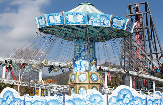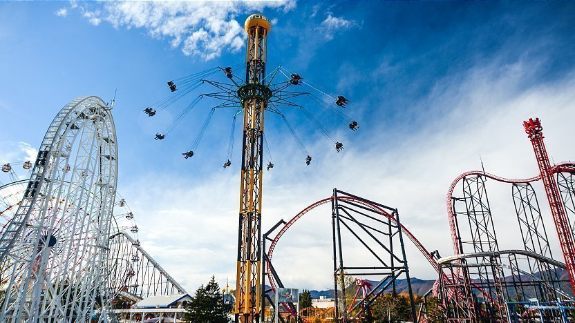 현재 공원에는 5 개의 주요 롤러코스터가 있다. 후지야마는 1996 년에 개장했을 때 세계에서 가장 높고 가장 빠른 롤러코스터였으며,여전히 세계 최고의 롤러코스터 중 하나로 여겨지고 있다. 도돈파(2001)는 현재 공원에서 가장 빠른 코스터이자 가장 빠른 가속 세계 기록 보유자입니다. 야나카(2006)는 자동차 내에서 회전하는 좌석을 가진"사차원"롤러코스터로,모든 롤러코스터 중 가장 역전력을 가지고 있다. 2011 년에 건설된 타카비샤는 121 도 각도로 떨어지는 세계에서 가장 가파른 롤러코스터입니다. 마지막으로,조콘(2023)은 갑작스러운 가속,날카로운 회전 및 뒷면이 있는 오토바이와 같은 코스터입니다.