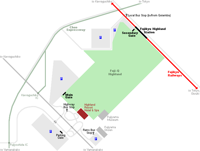 공원 밖의 하이랜드 리조트 호텔&스파는 정문에서 몇 걸음 떨어진 곳에 위치한 부속 호텔로 후지산이 내려다 보이는 멋진 전망과 후지큐 하이랜드 및 주변 관광 명소로 쉽게 접근 할 수 있습니다. 호텔 투숙객은 테마 파크 조기 입장 및 후지야마 온천 무료 입장 등의 특전을 즐길 수 있습니다.