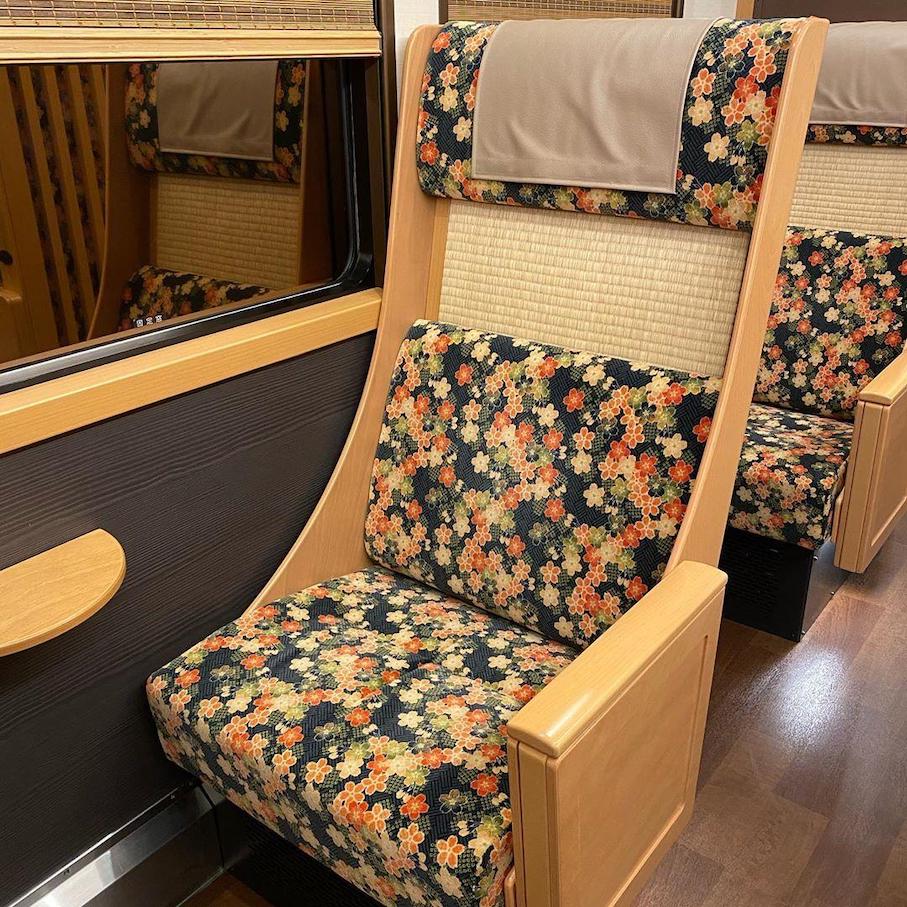 열차 내부는 전통적인 일본 가정처럼 디자인되어 있으며,쇼지를 모방한 창문 쉐이드와 반투명한 종이 시트로 된 방 분할기가 있습니다. 기차 의 좌석 은 조부모 의 집 에서 볼 수 있는 소파 를 연상 시키는 붉은 색 의 퇴색 된 천 으로 덮여 있다.