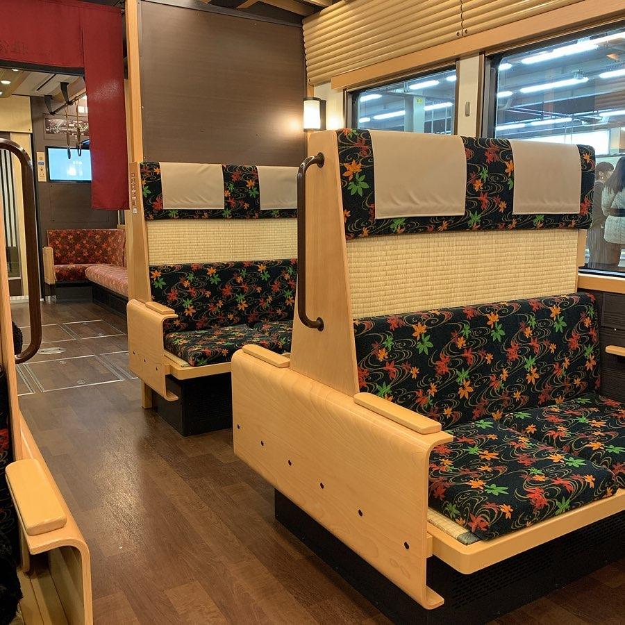 어두운 목재 패널,목판 인쇄 벽지 및 쇼지 스타일의 칸막이를 마차에 기대하십시오. 우메다 역에서 기차를 타면 이미 교토에 있는 것 같은 느낌을 주는 둥근 전망대와 같은 작은 세부 사항도 있습니다.