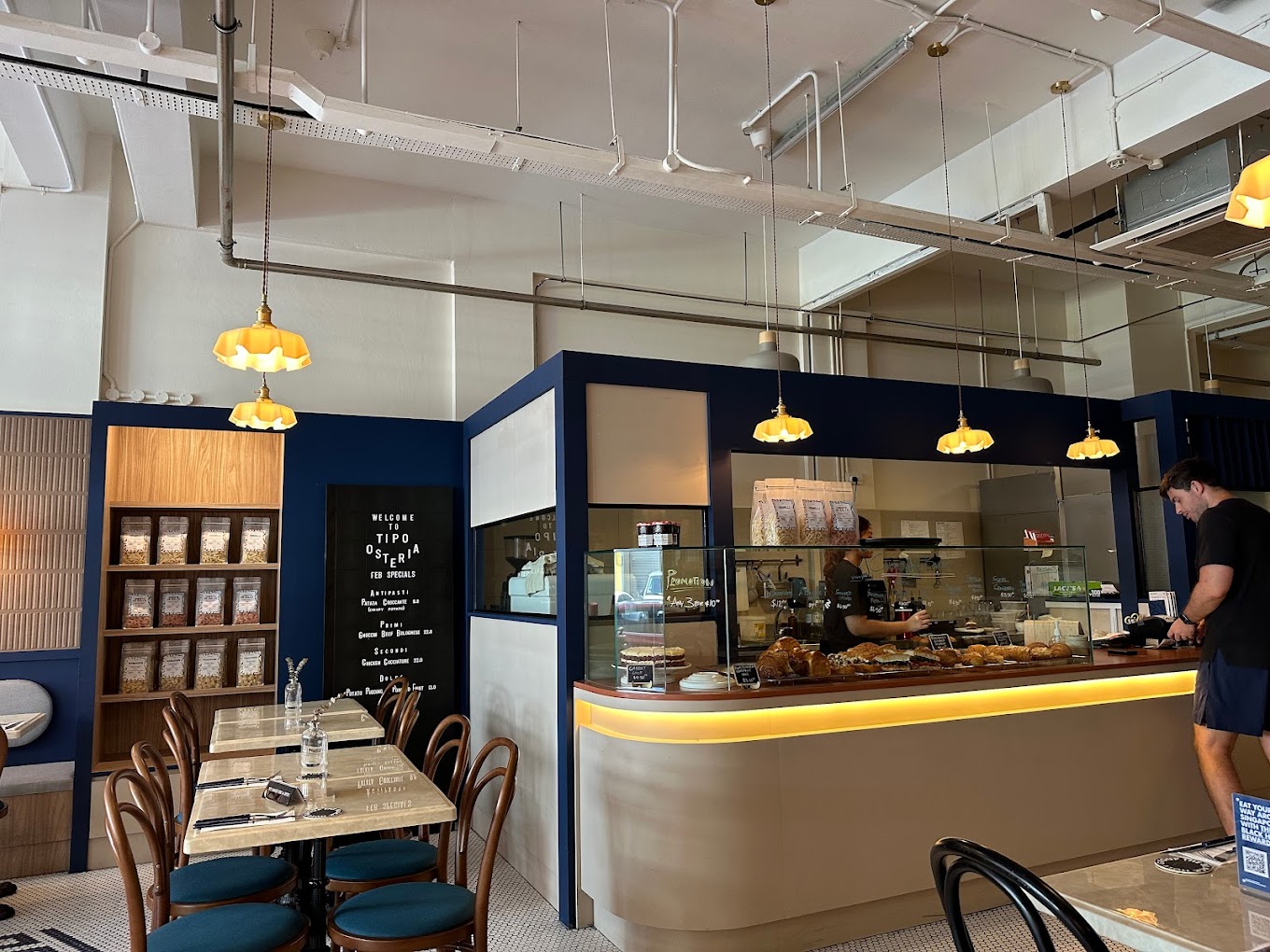 내부에는 작은 육각형 타일과 복고풍 의자로 꾸며져 있어 전체적으로 빈티지한 분위기가 물씬 풍깁니다. 간단한 식사를 원하신다면 오픈 카운터에서 다양한 종류의 페이스트리를 확인하실 수 있습니다. 또한 레스토랑의 분주한 주방을 들여다볼 수 있어 셰프들이 분주하게 요리하는 모습을 볼 수 있습니다.