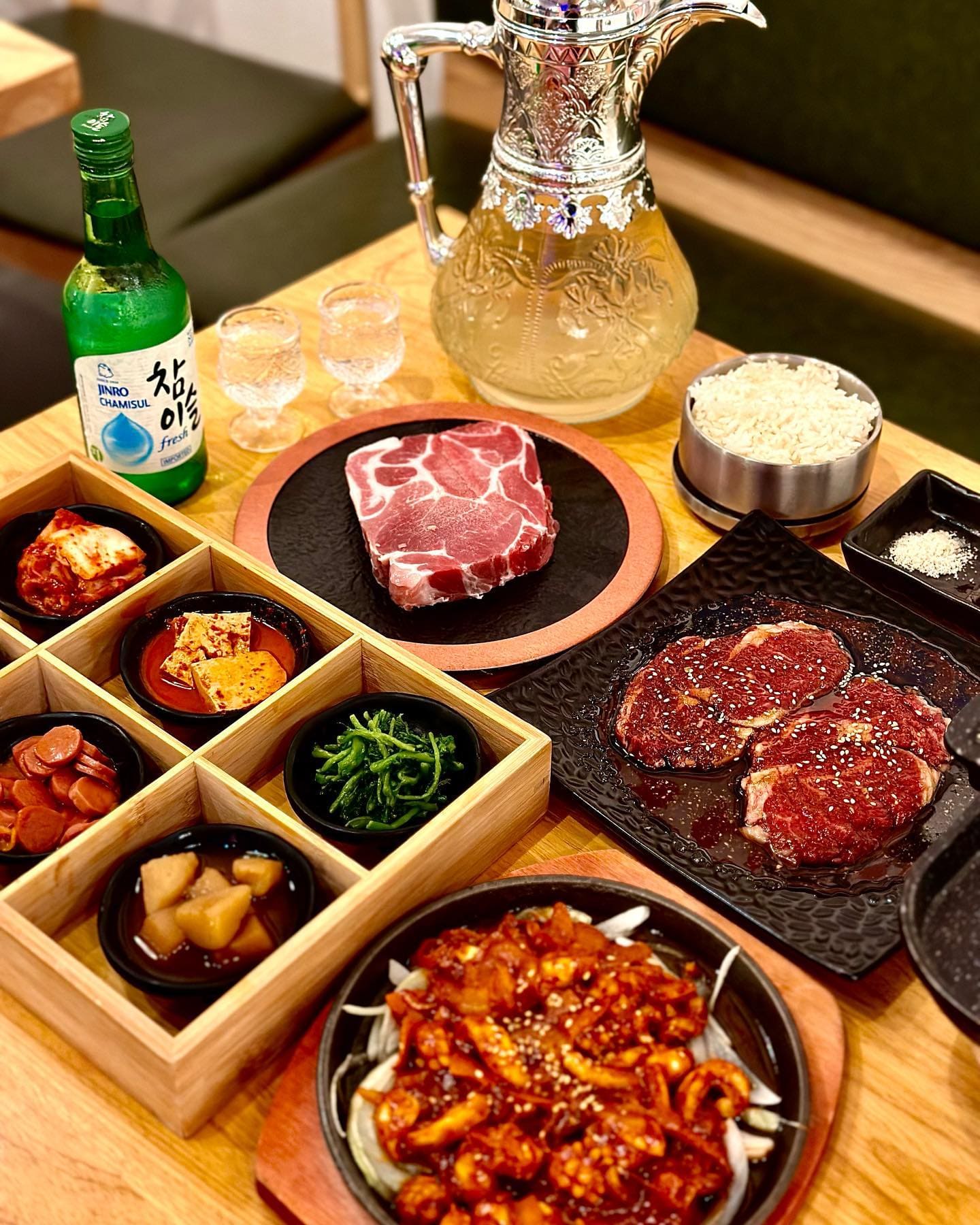 오징어, 생선, 닭고기, 돼지고기 등 다양한 고기와 함께 먹을 수 있는 핫 플레이트($14)는 꼭 맛봐야 할 메뉴입니다. 한국식 냉면($16), 한국식 짜장면($12), 한강 라면($8)과 같은 면 요리도 인상적인 메뉴입니다.