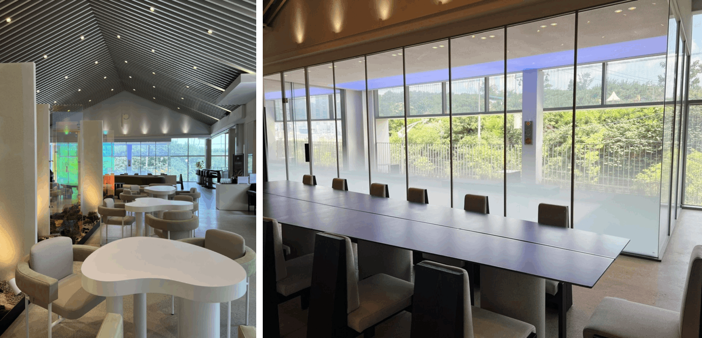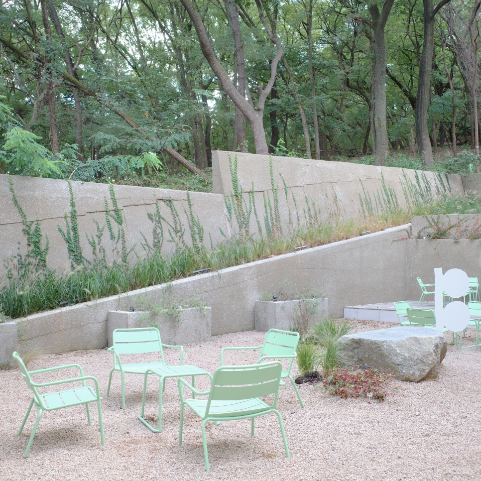 1층 정원에 야외 좌석 공간도 마련되어 있습니다. 파스텔 톤의 의자와 테이블이 바위 풍경 위에 놓인 이 공간은 무성한 녹지 속에서 해변의 정원 분위기를 연출하여 고요한 카페 경험을 선사합니다.