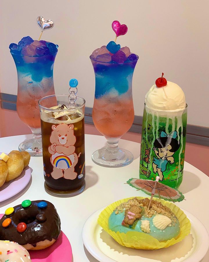 이 카페는 아메리카나와 키드코어를 적절히 섞은 복고풍 장식이 특징이며, 곳곳에 어린 시절 만화 장식과 그림이 가득합니다.