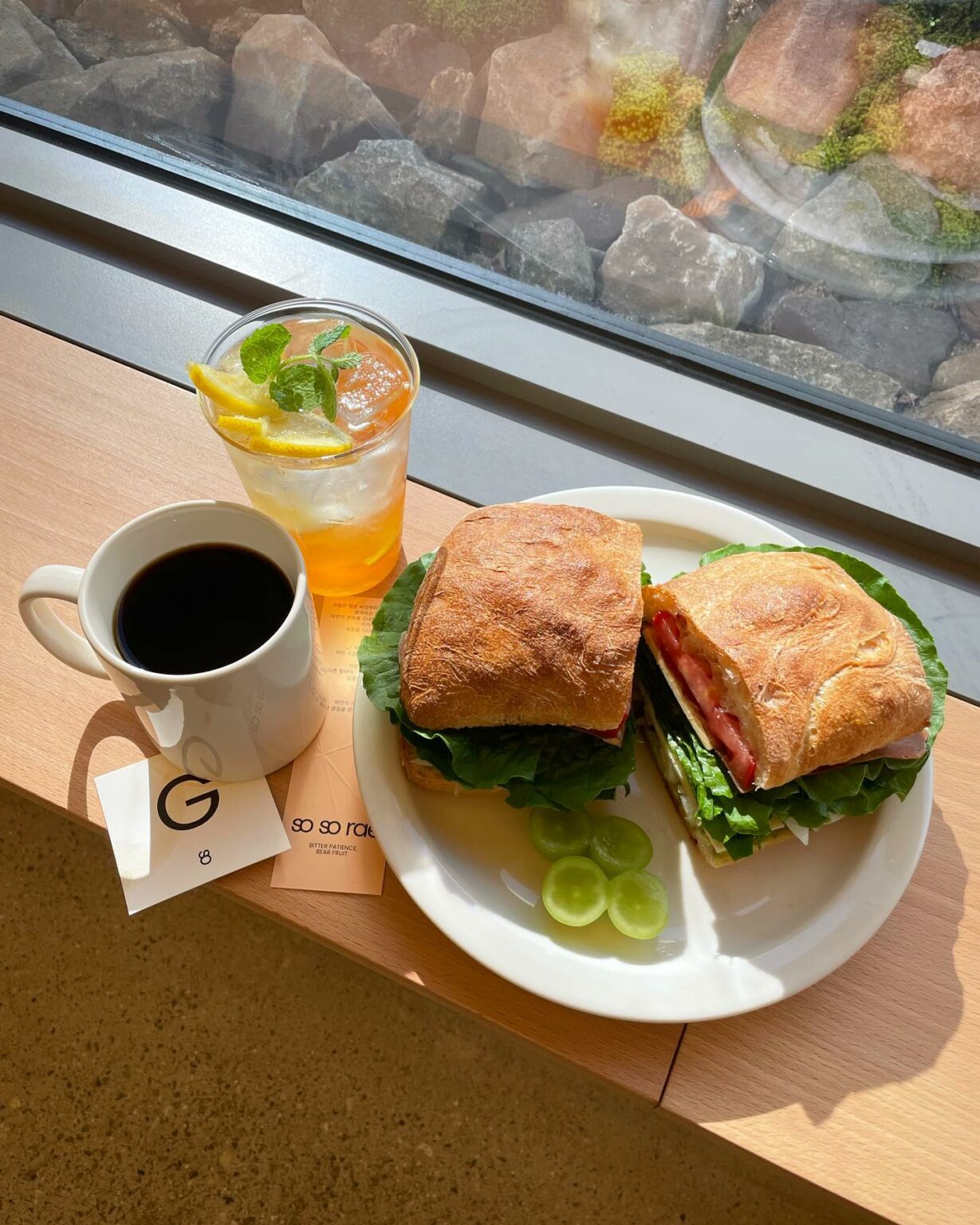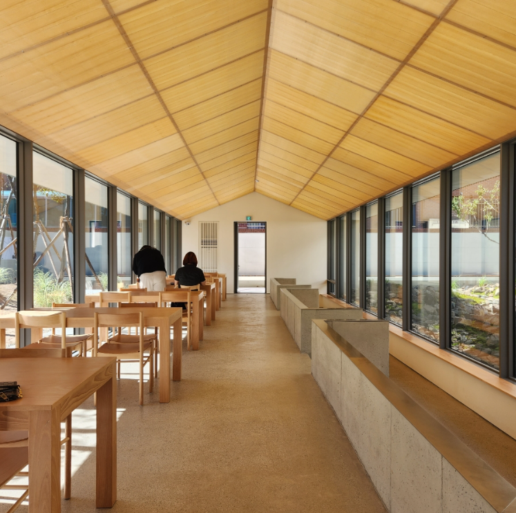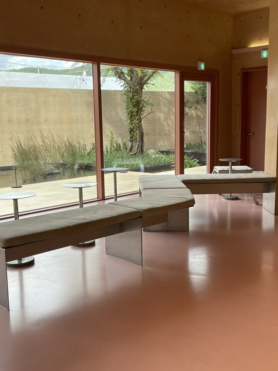 카페는 정원 바로 옆에 별관이 있으며, 자연이라는 테마에 어울리는 목재 인테리어로 꾸며져 있습니다. 더 좋은 점은 높은 창문이 있어 이곳에 앉으면 고요한 경치를 만끽할 수 있다는 점입니다.
