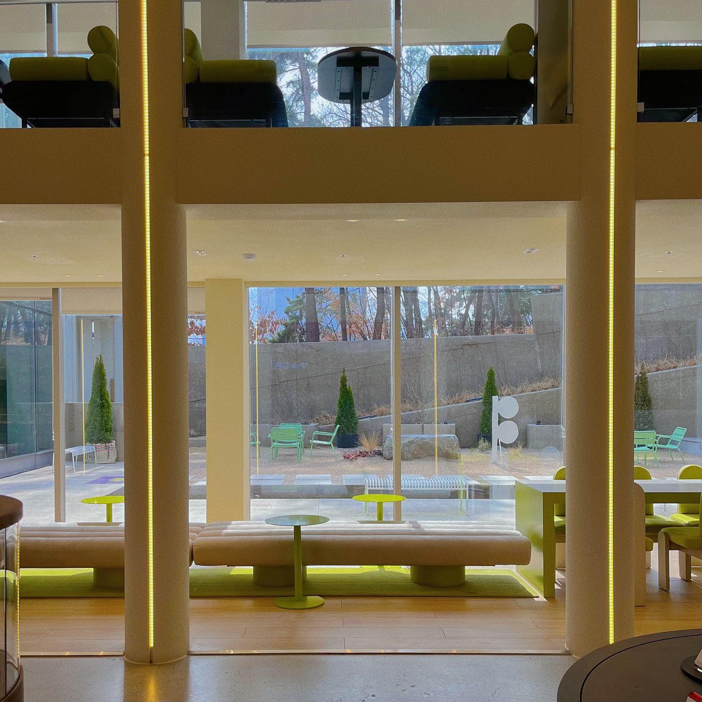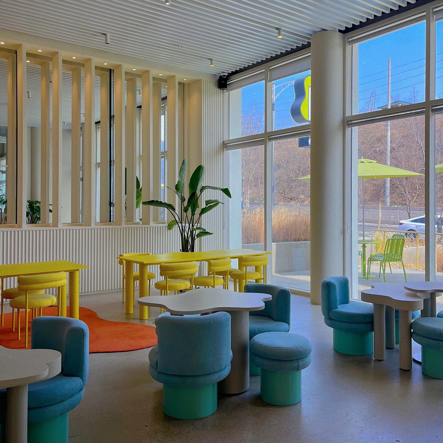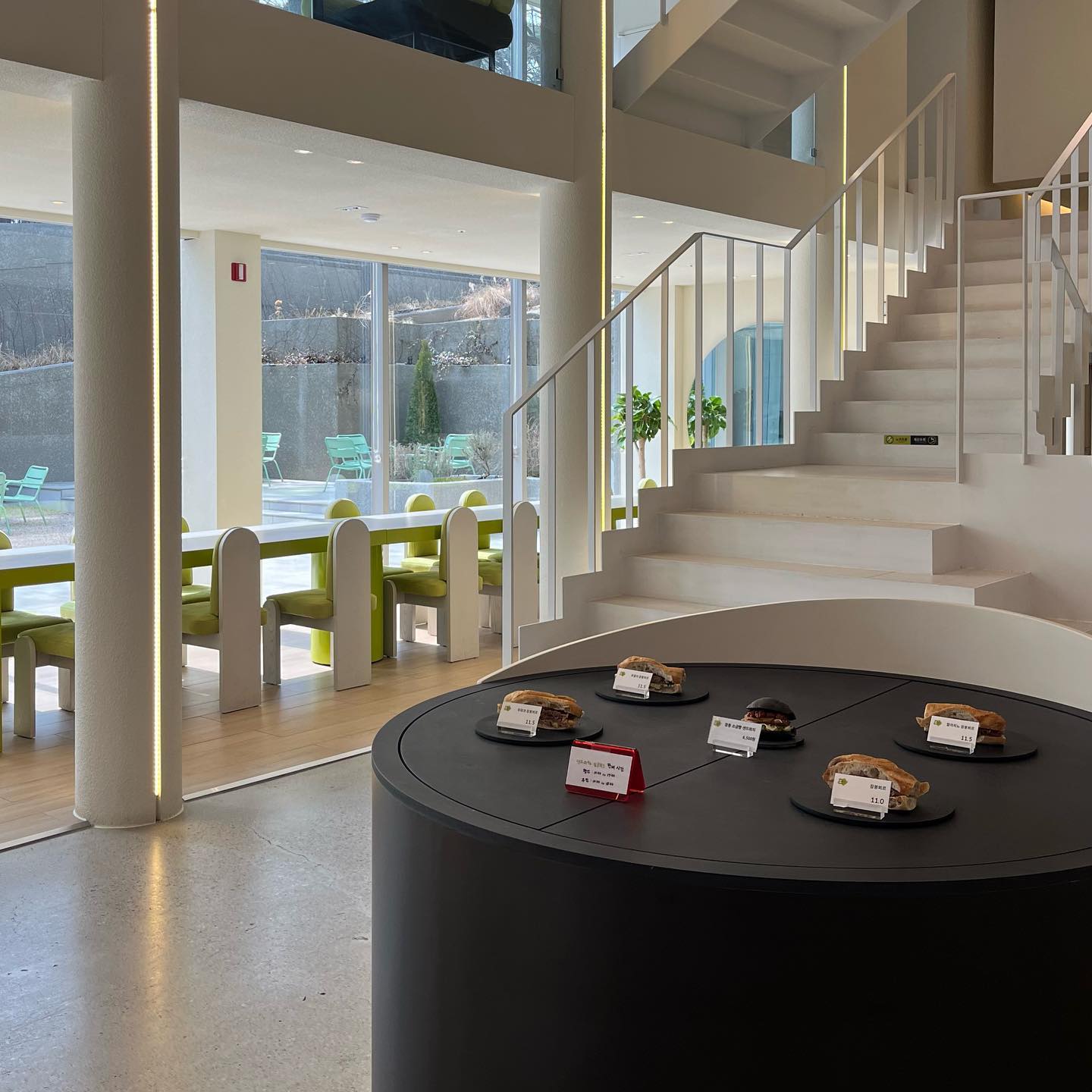 특히 1층에 있는 특이한 모양의 가구가 마음에 드는데, 선명한 색상과 미술관을 연상시키는 기발한 디자인이 인상적이었어요.