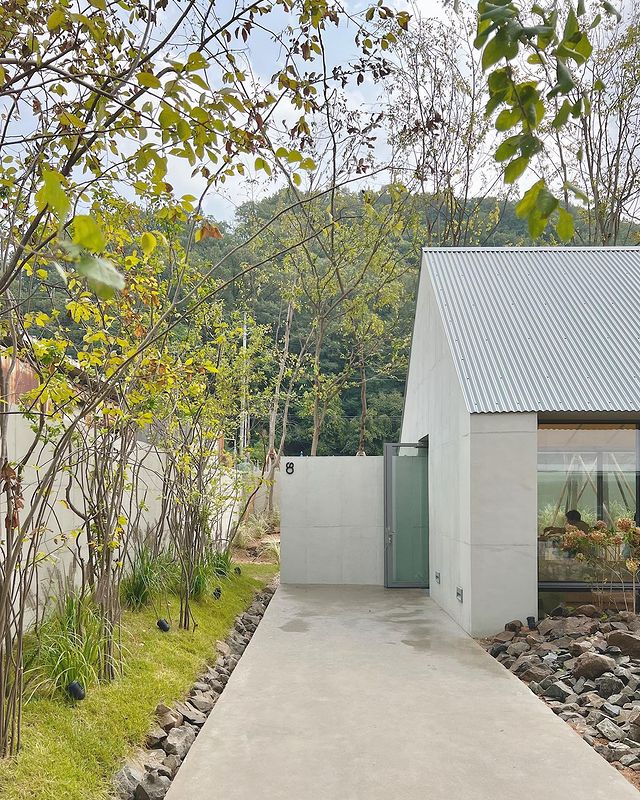1층 정원에 야외 좌석 공간도 마련되어 있습니다. 파스텔 톤의 의자와 테이블이 바위 풍경 위에 놓인 이 공간은 무성한 녹지 속에서 해변의 정원 분위기를 연출하여 고요한 카페 경험을 선사합니다.