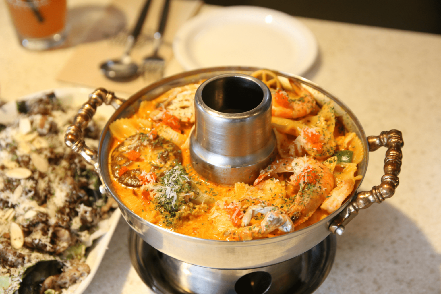 르 레파스는 전골 파스타로 유명한 곳입니다. 베스트셀러 메뉴인 쉬림프 로즈 파스타(23,000원, 약 16.20달러)는 새우와 오징어 등 해산물이 듬뿍 들어간 새우 로즈 소스를 곁들인 파스타입니다. 파르팔레와 로텔레 파스타가 섞여 있어 씹을 때마다 색다른 식감을 느낄 수 있습니다.