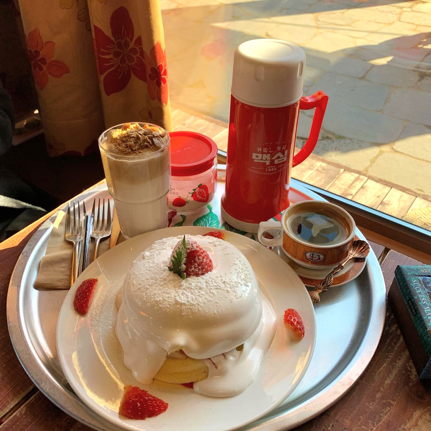 양지다방은 향수를 불러일으키는 장식과 분위기에도 불구하고 크림, 딸기 시럽, 딸기 슬라이스가 들어간 두툼한 수플레 팬케이크 두 조각으로 구성된 딸기 수플레 팬케이크(15,000원, ~USD10.49)와 같은 트렌디한 디저트를 판매하고 있습니다.