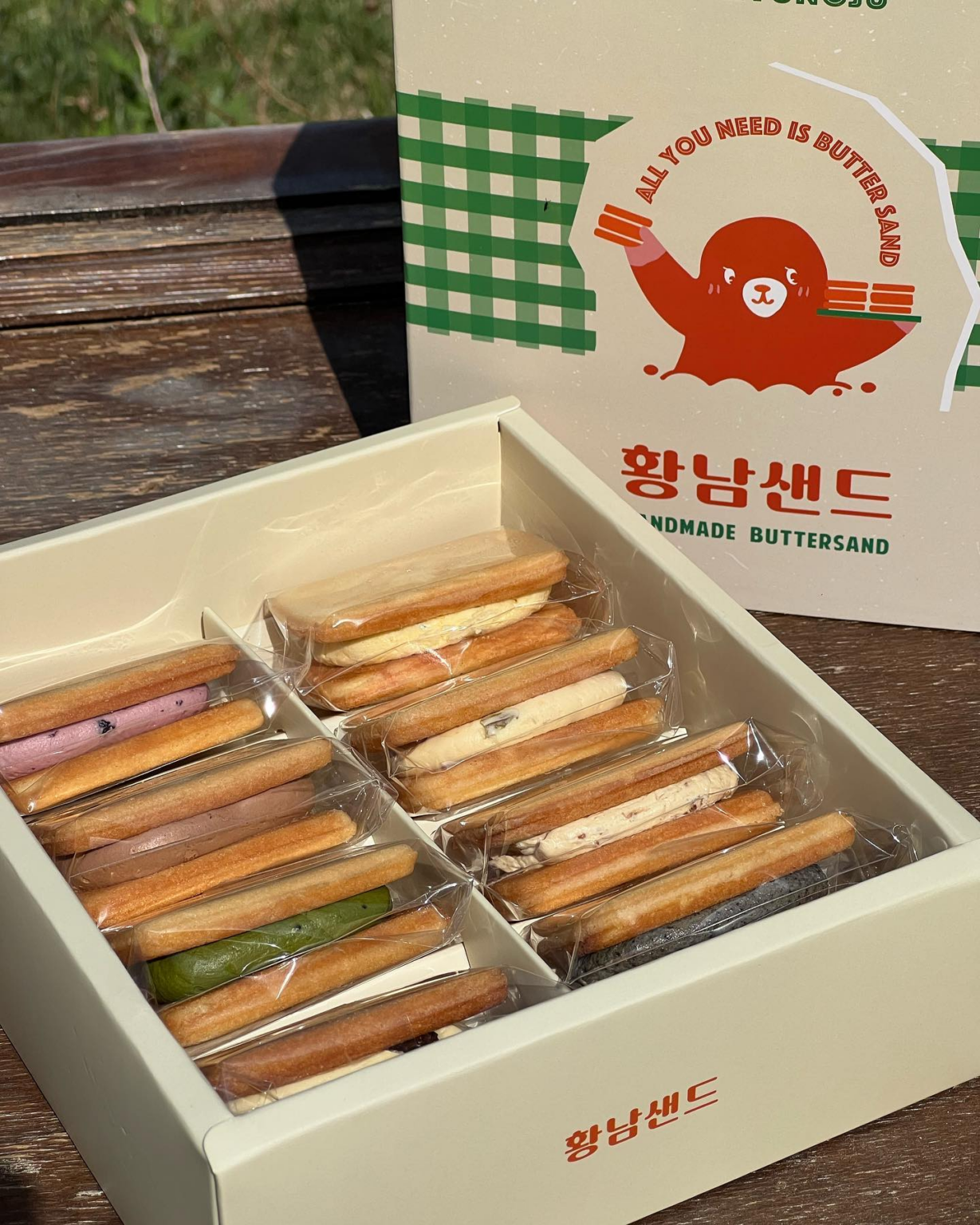 황남샌드는 8가지 맛의 프리미엄 버터 샌드위치를 판매합니다. 피스타치오 캐러멜, 레몬 딜, 럼 건포도, 무화과 밀크 등 흥미로운 맛도 있습니다.