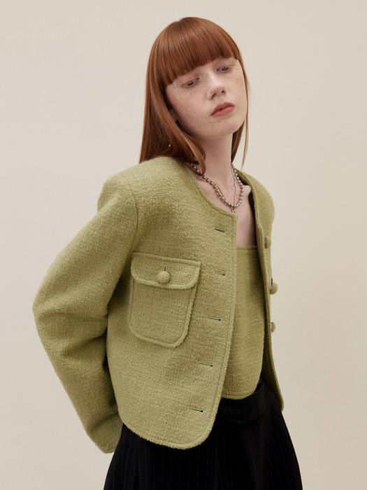 트렌디한 그린 컬러와 5버튼 조합이 돋보이는 트위드 자켓 입니다.